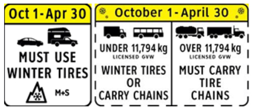 By law, Mud and Snow (M+S) or winter tires with the three-peaked mountain and snowflake are required for all passenger vehicles on Highway 97C until April 30.