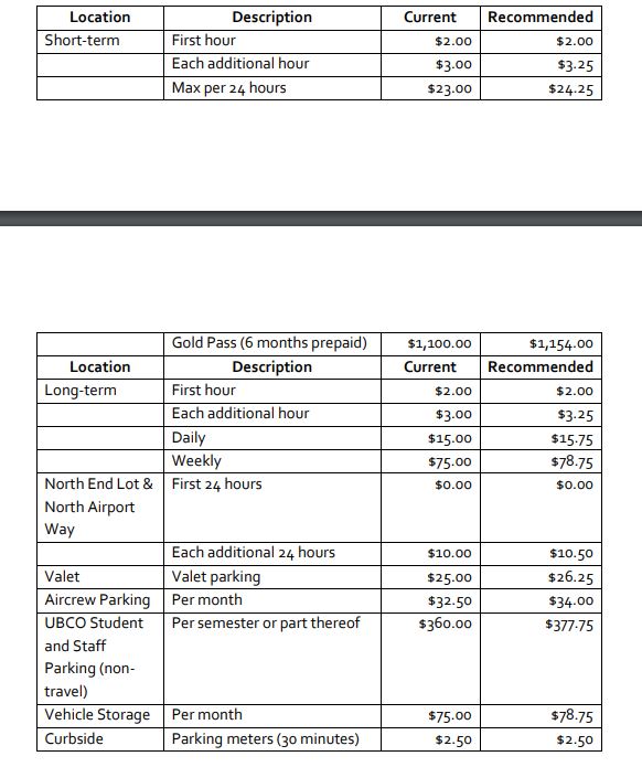 The increases affect most locations, including valet, aircrew, UBCO student and staff, short-term, and long-term lots.