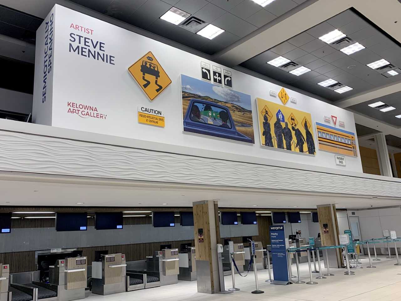 Above the airline check-in area, visitors can now see a series of paintings by Salmon Arm-based artist Steve Mennie featured in the 40-foot-long exhibition space organized by the Kelowna Art Gallery.