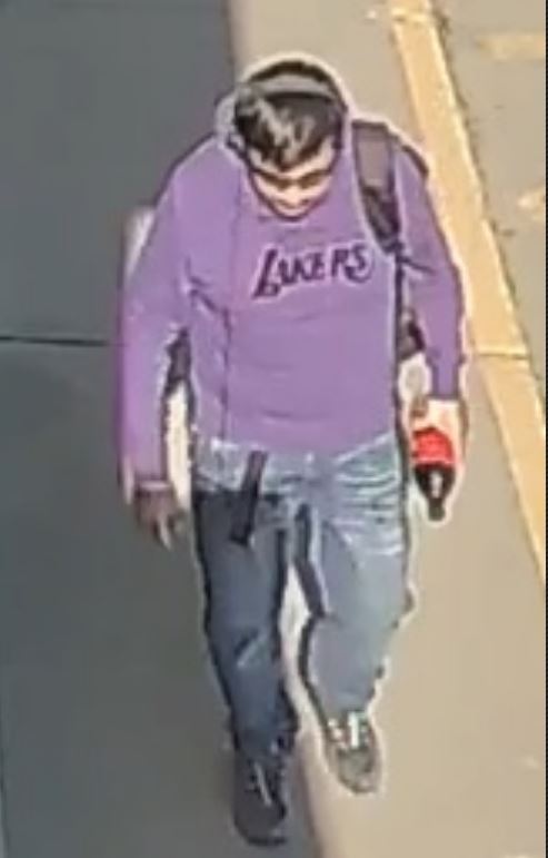 Hodges said the person of interest (POI) is described as an adult male, of average height and weight, short brown hair, wearing blue jeans, and a distinct purple hoodie with embroidered purple ‘Lakers’ text on the front, with a backpack and headphones.