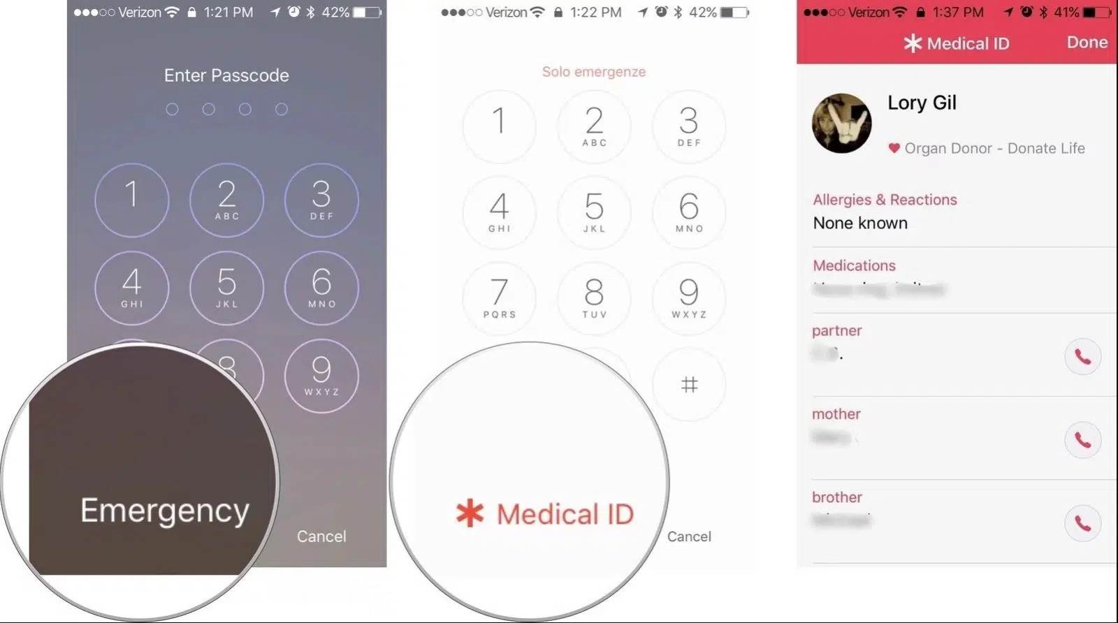 If you tap Emergency on the lower left of the locked screen, a new screen will show you * Medical ID. Tap on Medical ID, and if enabled, you’ll see the owner’s name and crucially, emergency contact numbers! In my case, I learned the spouse’s name and was able to call him to arrange to meet!