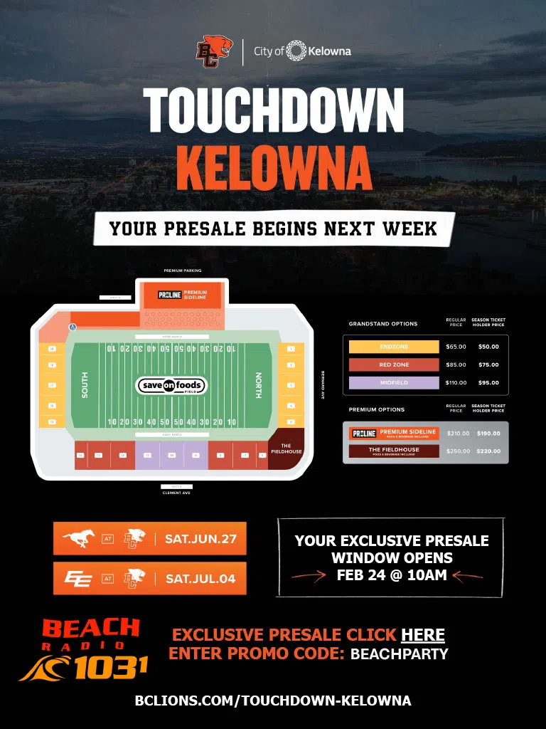 Stay locked to 103.1 BEACH Radio for more chances to win tickets, game-day fun, and everything that rocks Kelowna all summer long!